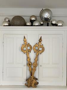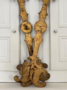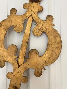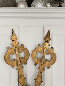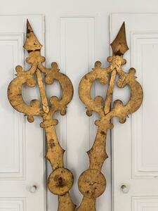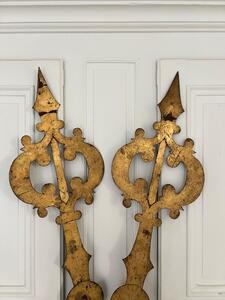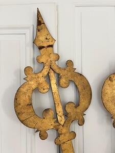 Aiguilles de cadran d’église XIXème. Métal plein riveté et doré à la feuille. Longueur 119 cm. Largeur 28 cm.