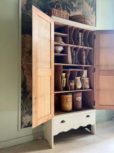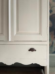 Armoire de métier début XXème. Intérieur compartimenté. Façade à portes panneautées et un grand tiroir. Bois peint blanc cassé. Serrure et clé en fonctionnement. Hauteur 210,5 cm. Longueur 97 cm. Largeur 36 cm