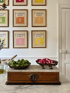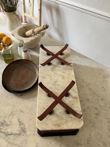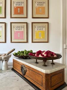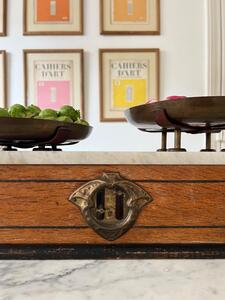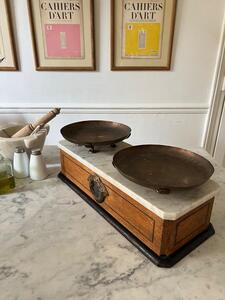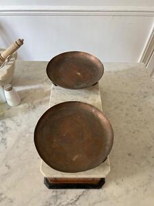 Balance double-face XIXème. Chêne, marbre, cuivre. Longueur 49 cm. Largeur 20 cm. Hauteur 18 cm. Diamètre coupelles 22,5 cm.