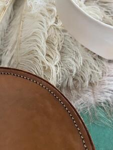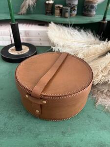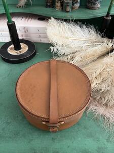 Boîte à cols. Cuir piqué sellier. Vers 1950. Vendue avec col d’origine. Diamètre 17,5 cm. Hauteur 7 cm,