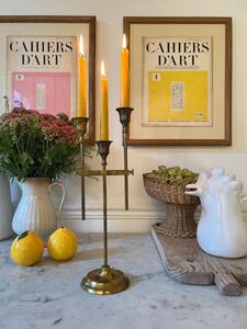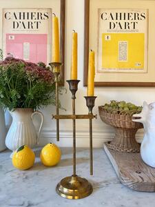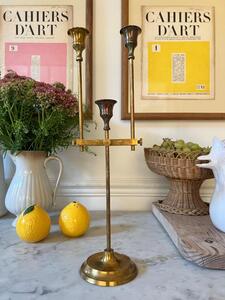 Bougeoir ajustable en laiton patiné. Hauteur des tiges réglable, système de serrage à vis. Vers 1940. Hauteur de 28 cm à 41 cm. Diamètre base 9,5 cm.