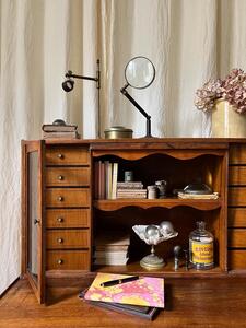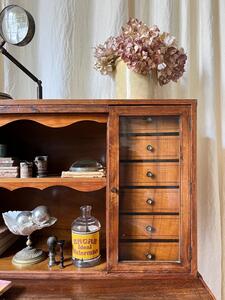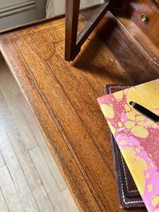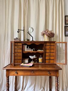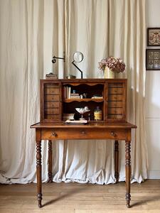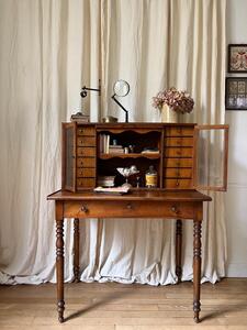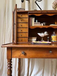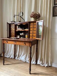 Bureau dit bonheur-du-jour en 2 parties. Gradin à tiroirs sous portes de verres bullées d’origine. 1 grand tiroir en façade (la serrure ne fonctionne pas). Attributs laiton. Bois de pacage et massif (essences diverses, chêne, acacia, à préciser). Hauteur plateau 77,5 cm, hauteur sous ceinture 63,5 cm, hauteur totale 124 cm. Longueur 96 cm. Largeur partie basse 58 cm. Largeur partie haute 27,5 cm. Seconde partie du XIXème siècle.