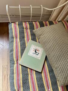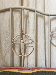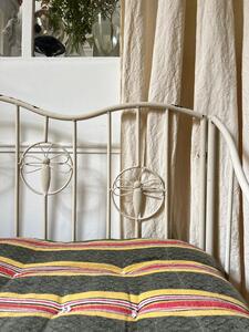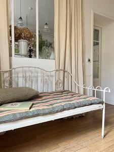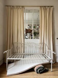 Canapé en métal laqué. Patine d’origine. Matelas neuf, garni toile de lin. Surmatelas ancien. Structure démontable. Vers 1970. Longueur 170 cm. Largeur 77 cm. Hauteur assise sans matelas 42 cm, et 50 cm avec les 2 matelas. Hauteur dossier 92 cm.
