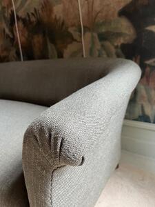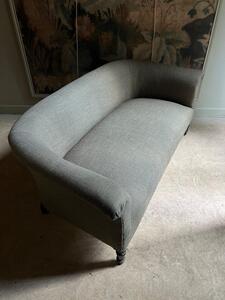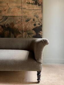 Canapé XIXème, époque Napoléon III. Retapissé à neuf, garniture crin, toile texturée vert kaki. Pieds tournés bois noirci. Longueur 167 cm. Profondeur 80 cm. Hauteur assise 36 cm. Hauteur dossier 65 cm.