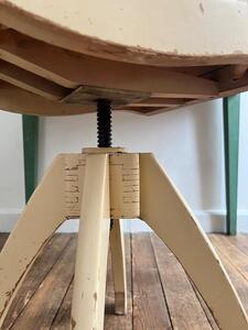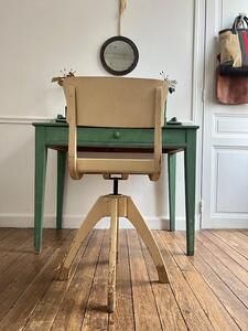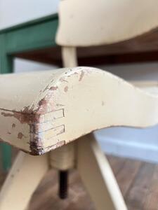 Chaise de bureau / d’atelier ajustable, pivotante. Bois peint patine crème d’origine. Vers 1940. Hauteur réglable de 46 cm à 64 cm. Largeur 40 cm. Profondeur 50 cm.