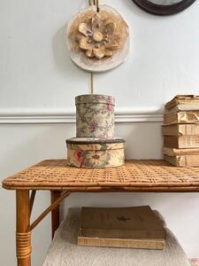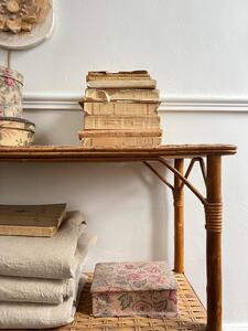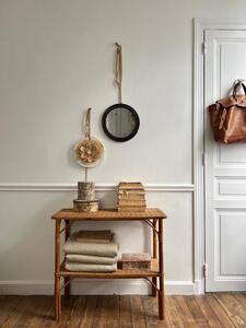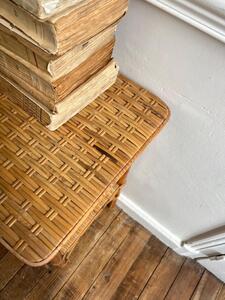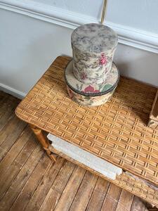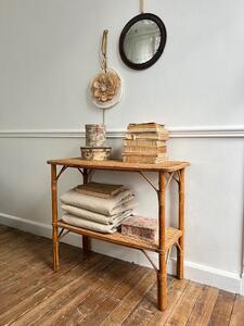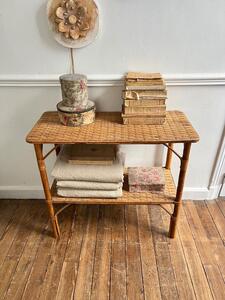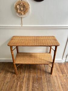 Console en rotin tressé. Vers 1950. Longueur 81 cm. Largeur 36 cm. Hauteur 71 cm. Hauteur plateau inférieur 31 cm.