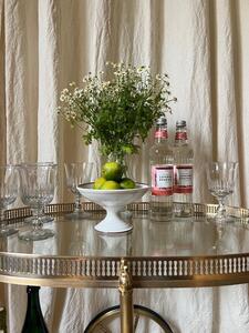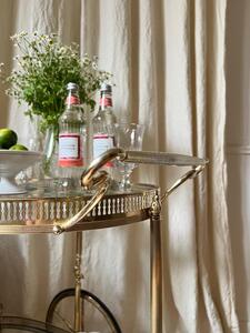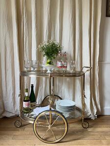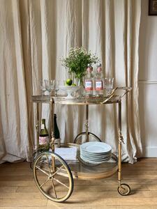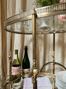 Desserte roulante en laiton. Plateaux verre. Poignée et fûts cannelés. Décor de chérubins. Longueur 77 cm. Largeur 54 cm. Hauteur 72 cm.