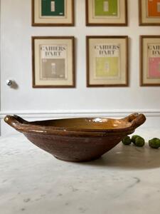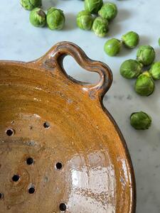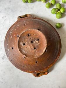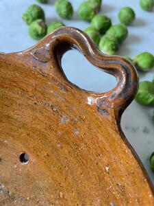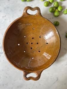 Égouttoir en terre vernissée. Art populaire, vers 1900. Longueur y compris poignées 33 cm. Diamètre 27,5 cm. Hauteur 10,5 cm.