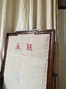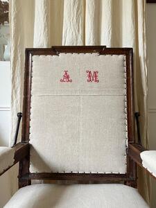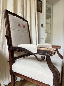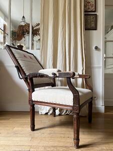 Fauteuil à crémaillère en noyer. Époque Louis XVI. Retapissé à neuf avec une toile de chanvre ancienne monogrammée. Largeur 68 cm. Profondeur 65 cm. Hauteur assise 43 cm. Hauteur dossier 111 cm.