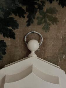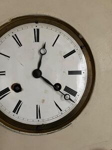 Horloge XIXème. Tôle peinte, couleur crème et bronze. Verre convexe. A priori, système en fonctionnement. Diamètre 35 cm. Hauteur y compris attache 45 cm. Profondeur 12 cm.