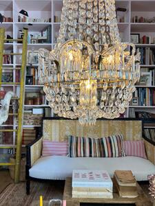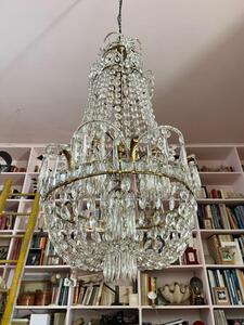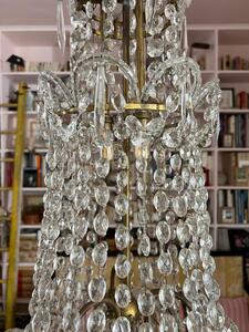 Important lustre bronze et pampilles verre. 7 feux intérieurs. 3 étages de corolles perlées. Électricité ok. Hauteur 95 cm (+ chaîne selon besoins). Diamètre 40 cm.
