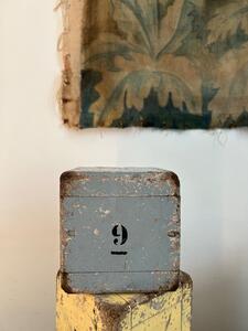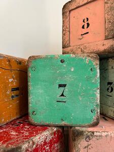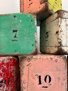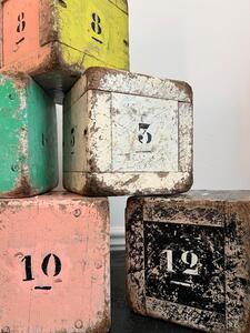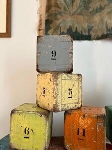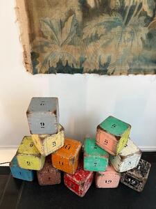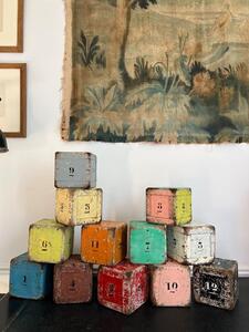 Jeu de cubes XL. Bois massif peint, patine d’origine. 12 cm x 12 cm x 12 cm. Vers 1940.