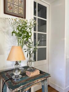 Lampe à poser. Boules verre. Métal chromé. Électricité refaite à neuf. Vendue sans abat-jour. Vers 1940. Hauteur hors douille 17 cm. Diamètre base 8 cm.