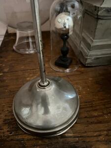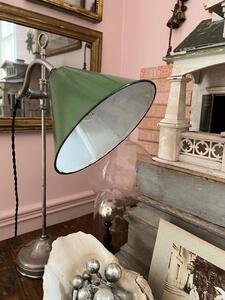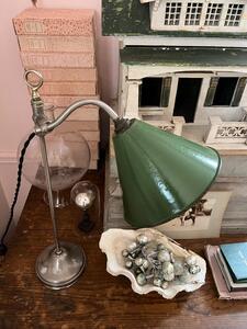Lampe de bureau ajustable. Acier nickelé et réflecteur tôle émaillée. Hauteur et inclinaison réglables. Électricité refaite à neuf. Vers 1920. Hauteur 52 cm. Diamètre base 12 cm. Diamètre réflecteur 19 cm.