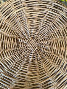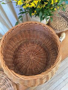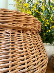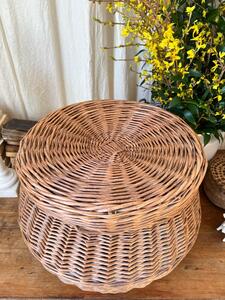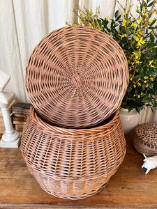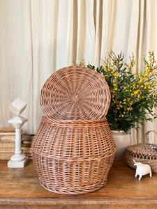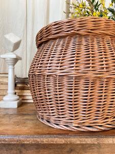 Large corbeille couverte en osier. Vers 1960. Hauteur 40 cm. Diamètre 48 cm.