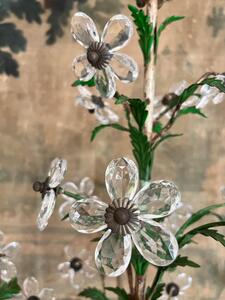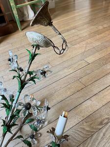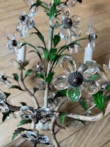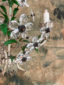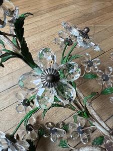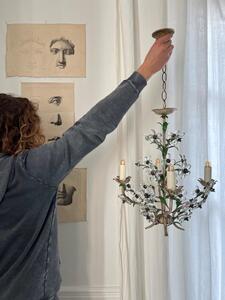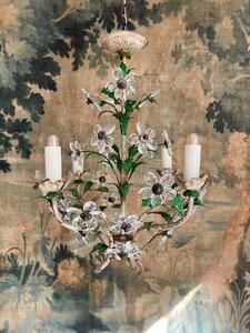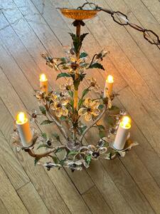 Lustre en tôle peinte, fleurettes de verre et laiton. 4 bras de lumière. Électricité refaite à neuf. Patine d’origine. Vers 1940. Hauteur 51 cm / hauteur totale y compris chaîne et cache 80 cm. Diamètre 43 cm.