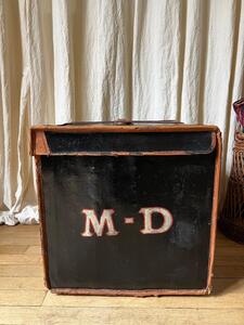 Malle chiffrée MD. Époque XIXème. Toile enduite, cuir piqué sellier, laiton. Serrure et clé ok. Anciennes restaurations des sangles. Intérieur toile crème. Hauteur 52 cm. Longueur 52 cm. Largeur 52 cm.