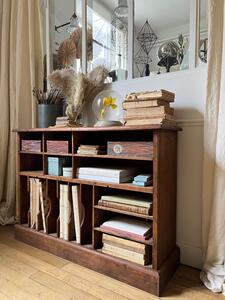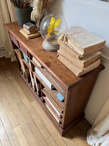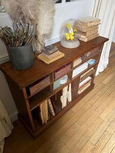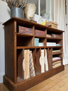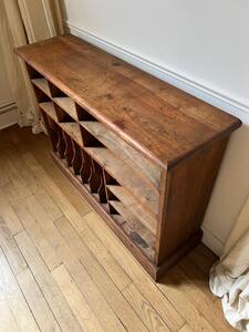 Meuble classeur compartimentĂ© en frĂȘne. Sur plinthe. Vers 1940. Longueur 105 cm. Largeur 30 cm. Hauteur 76 cm.