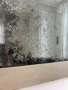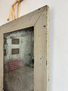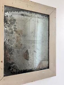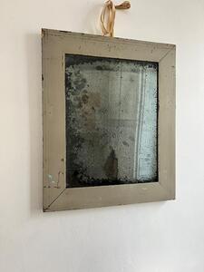 Miroir tain mercure noirci. Baguette peinte, vieux gris. Le dos n’est pas d’origine. 64,5 cm x 53 cm. Épaisseur 2 cm.