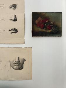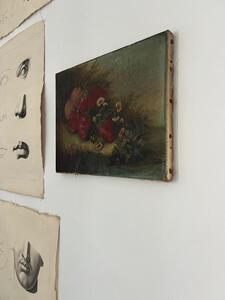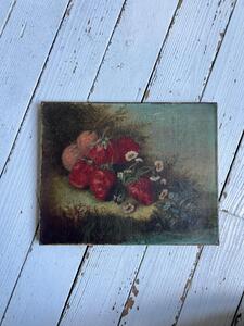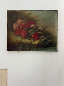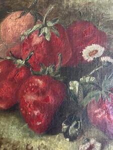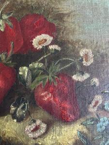 Nature morte fin XIXème. Huile sur toile sur châssis. Fraises et pâquerettes. 27 cm x 21,5 cm.