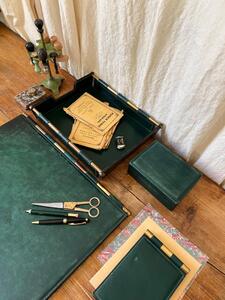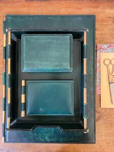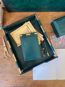 Nécessaire de bureau. Cuir piqué sellier, laiton. Banette, sous-main ouvrant, boîte à cartes, porte-calepin. Vers 1960.