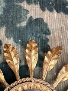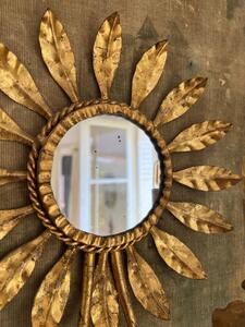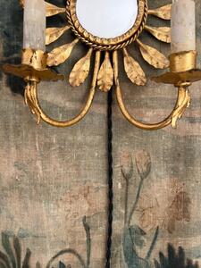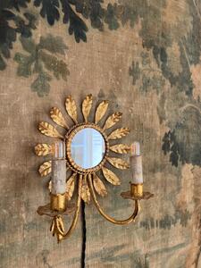 Paire d’appliques en métal doré. Soleil-miroir. Électricité ok. Vers 1950. Hauteur 30 cm. Largeur 23 cm. Profondeur 11 cm.