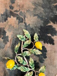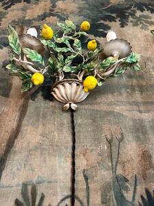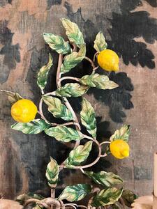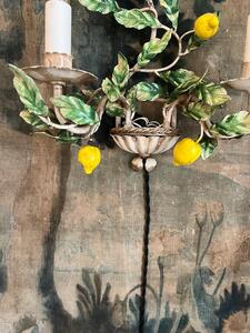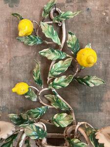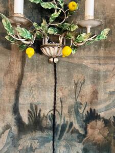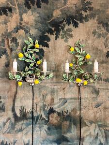 Paire d’appliques en métal peint. Décor de feuillages et citrons. Électricité ok. Vers 1950. Hauteur 41 cm. Largeur 31 cm. Profondeur 15 cm.