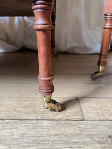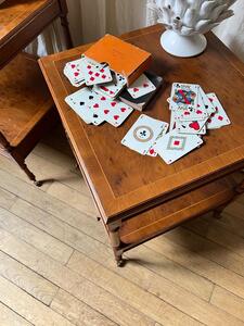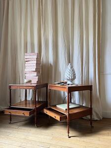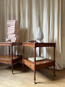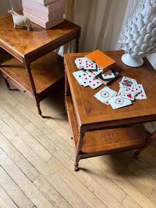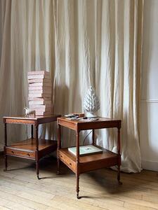 Paire de bouts de canapé Édouardiens. Vers 1910. Tiroirs en façade. Roulettes et poignées bronze. Sapelli et placage de frêne moucheté. 47 cm x 47 cm. Hauteur 60 cm.