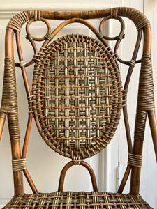 Paire de chaises en rotin. Par Perret & Vibert. Plaque émaillée du fabricant. Vers 1920. Largeur 41 cm. Profondeur 51 cm. Hauteur assise 45 cm. Hauteur dossier 91 cm.