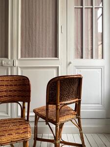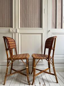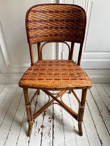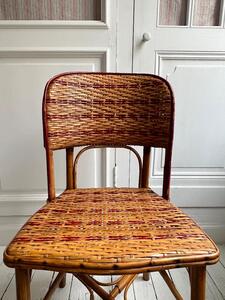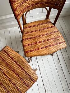Paire de chaises en rotin tressé. Naturel et rouge bordeaux. Vers 1920. Largeur 41 cm. Profondeur 48 cm. Hauteur assise 46 cm. Hauteur dossier 82 cm.