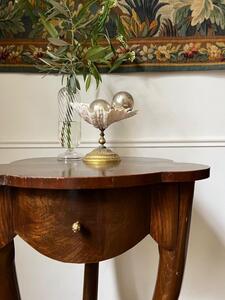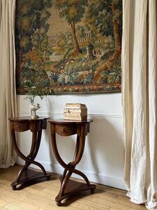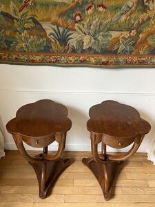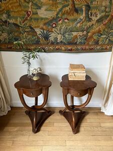 Paire de guéridons tripodes de style Biedermeier. Frêne et plaquage de frêne. Bouton laiton. Vers 1920. Hauteur 74 cm. Longueur 45 cm. Largeur 45 cm. Traces et rayures d’usage.