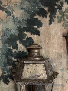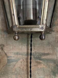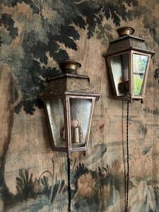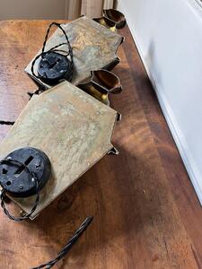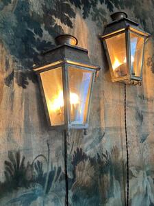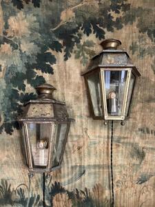 Paire de lanternes en applique. Laiton patiné et verre. Électricité ok. Vers 1970. Hauteur 42 cm. Largeur 29 cm. Profondeur 15 cm.