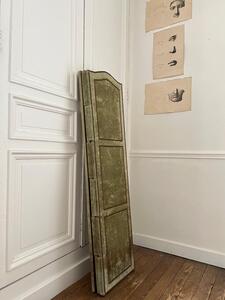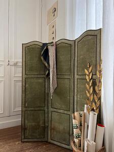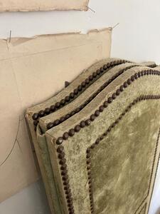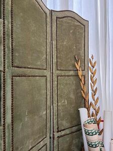Paravent 3 feuilles en velours. Clous tapissiers. Velours vert. Traces et usures. Vers 1950. 3 feuilles de 40 cm. Longueur totale 120 cm. Hauteur 150 cm.