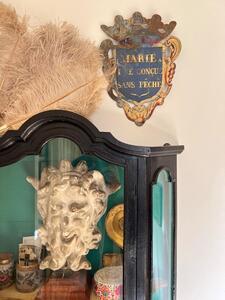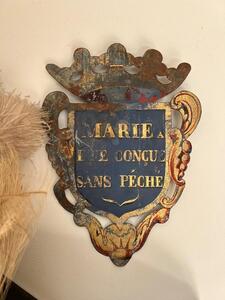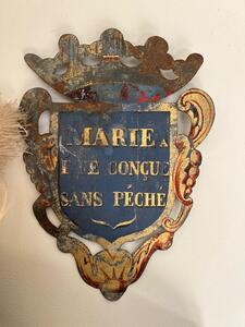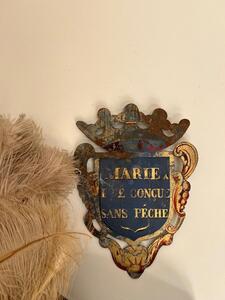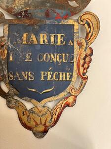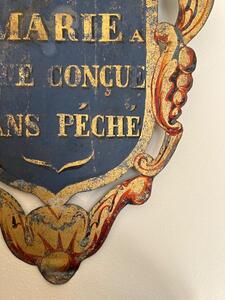 Plaque de dévotion à la gloire de Marie. Époque XIXème. Tôle peinte, dorure défraîchie. Hauteur 32 cm. Largeur 23 cm.