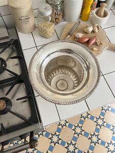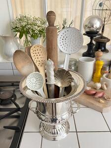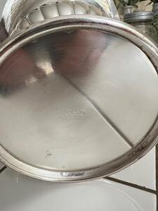 Seau à champagne en métal argenté. Modèle Medicis. Fabrication anglaise. Marques d’usage. Vers 1960. Hauteur 25 cm. Diamètre col 24 cm. Diamètre base 14 cm.