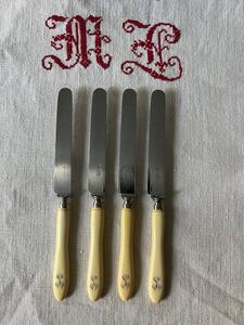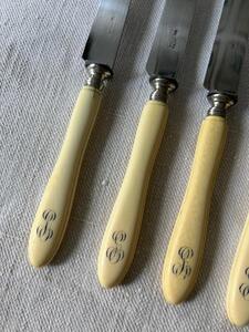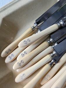 Service 12 couteaux à dessert / fromage. Manches os, monogramme. Viroles argent. Longueur 21 cm. Vers 1880.