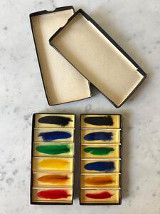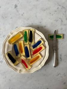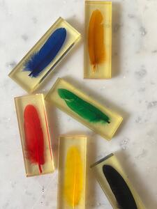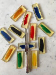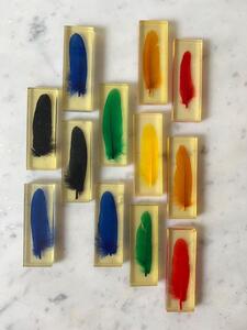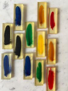 Service 12 porte-couteaux. Plumes colorées en inclusion de résine. Vers 1970. Un petit éclat sur une pièce. Coffrets d’origine. Longueur 8 cm. Largeur 3 cm. Épaisseur 1 cm.