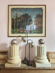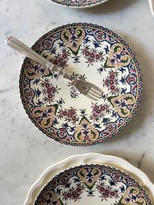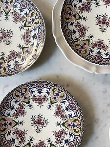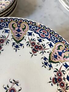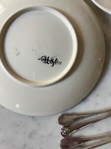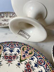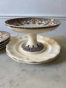 Service à dessert ou entremets. Sarreguemines. 4 assiettes + 1 plat piédouche. 1 petit éclat sur le pourtour du plat (voir photo). Assiettes, diamètre 21 cm. Plat, diamètre 22 cm, hauteur 13 cm.