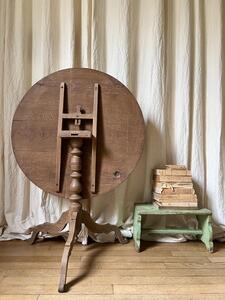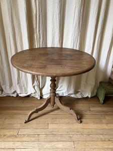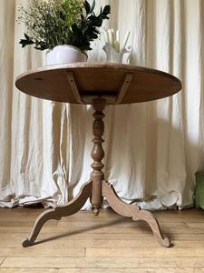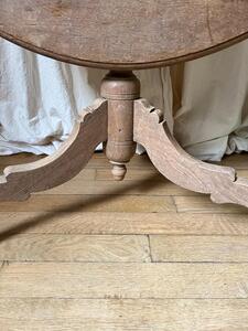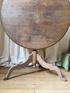 Table basculante en chêne clair. Vers 1900. Diamètre 81 cm. Hauteur 73 cm. Envergure pieds 64 cm.