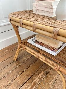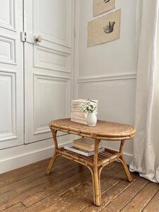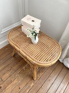 Table basse ovale en rotin. Plateau cannage. Vers 1960. Longueur 76 cm. Largeur 46 cm. Hauteur 46 cm.