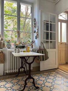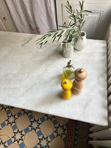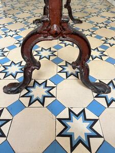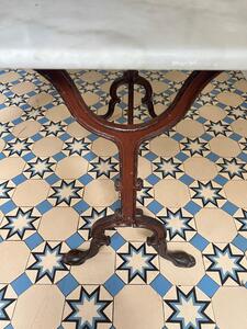 Table de bistrot. Piètement fonte, patine brune. Plateau marbre blanc, traces d’usage, un angle élimé. Vers 1920. Longueur 100 cm. Largeur 60 cm. Hauteur 71,5 cm.
