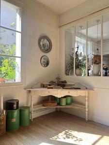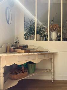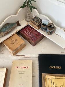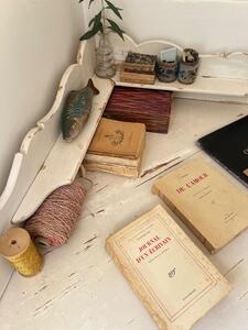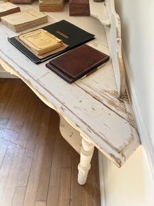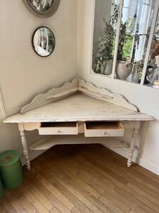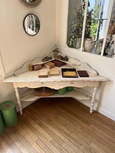 Table d’encoignure. Blanc crème, patine d’origine. Vers 1900. Longueur des côtés 115 cm. Longueur façade 160 cm. Hauteur plateau 75 cm. Hauteur gradin 97 cm.