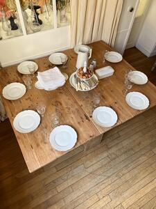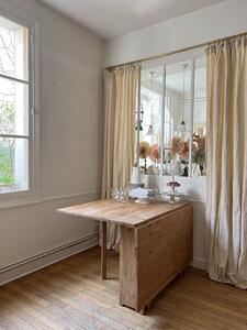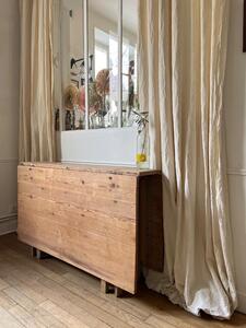 Table gateleg en sapin brut. Début XIXème.Modulable par système d’abattants sur pieds croisillons. 10 / 12 couverts. Largeur 124 cm. Hauteur 77,5 cm. Longueur totalement ouverte 153 cm. Longueur semi-ouverte 91 cm. Longueur fermée 29 cm.