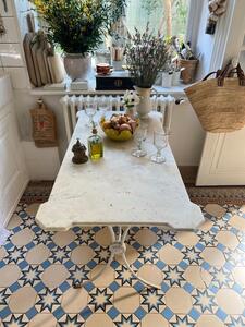 Table de jardin XIXème. Piètement métal patine d’origine. Plateau marbre blanc. Traces d’usage. Longueur 113,5 cm. Largeur 60 cm. Hauteur 74 cm.
