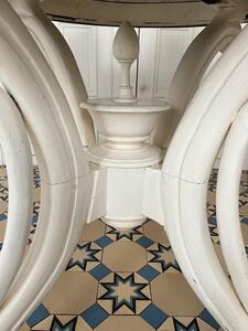 Table Thonet en bois courbé peint et plateau marbre. Une ancienne restauration du plateau, visible sur photo. Vers 1910. Diamètre 109 cm. Hauteur 78 cm, hauteur sous ceinture 69,5 cm.